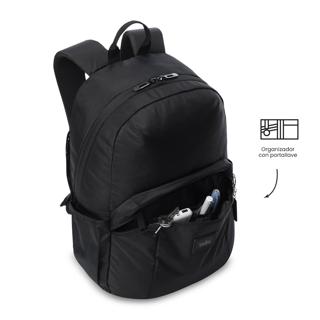 Carry everything with style and organization! The Trik backpack is made from RPET canvas using 12 recycled plastic bottles and features a laptop compartment for up to 14 inches. It includes an organizer with a key holder, a hidden pocket, space for a bottle, and a padded back for extra comfort. In addition, it comes with a rubber keychain embossed with the logo, making this backpack a functional and eco-friendly option. Perfect for everyday use!