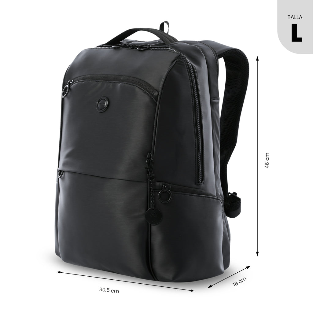Carry all the essentials with organization and comfort! The Laila office backpack is made of abrasion-resistant canvas, with a padded compartment for a 16-inch laptop and a functional design. It includes a simple organizer, key holder, secret pocket, and a strap for a wheeled system. Additionally, its bottle pocket and padded straps provide comfort throughout the day. It comes with a metal coin-style keychain with a logo.