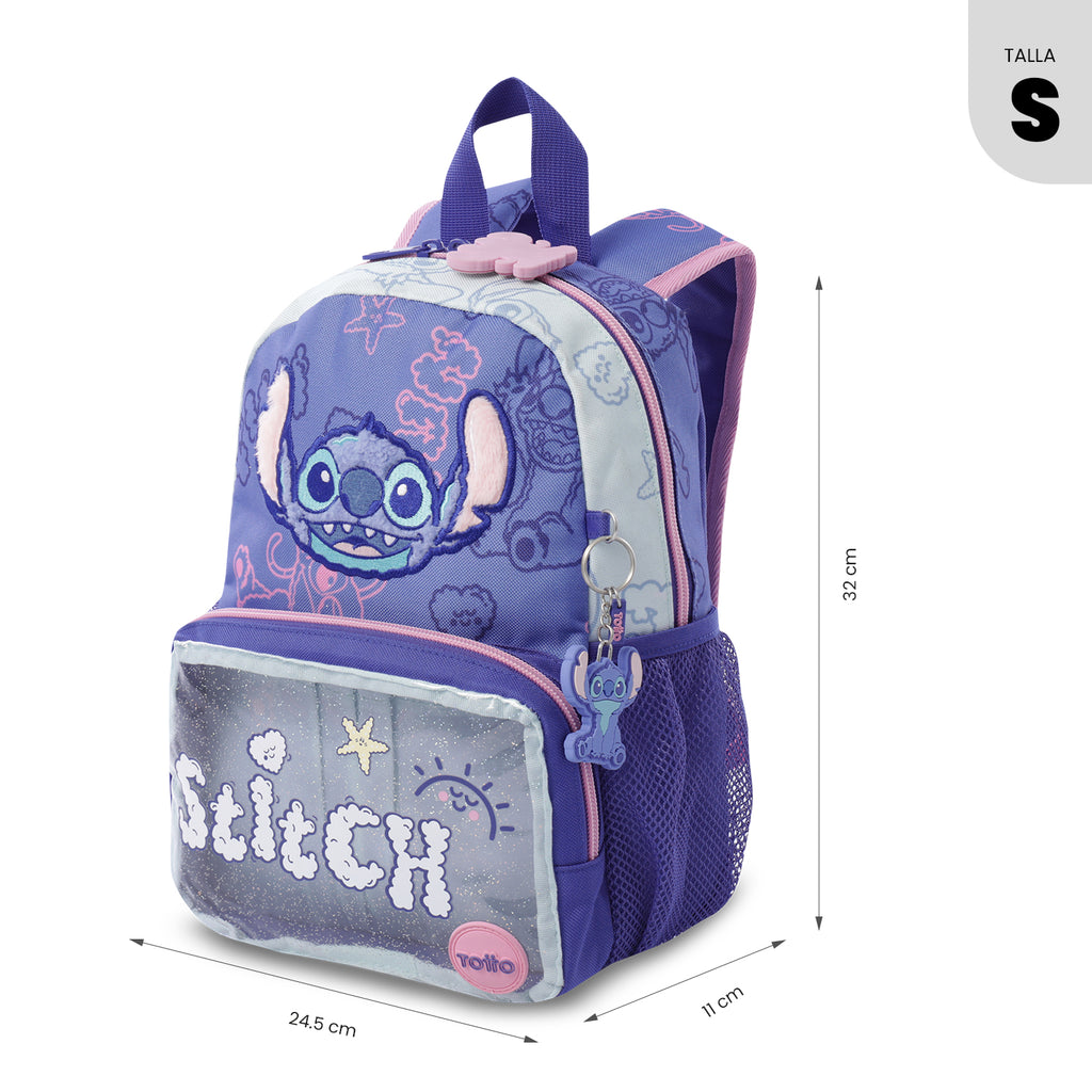 Make her school day even more special! The small Stitch On The Beach backpack for girls features a plush embroidered character, a main compartment with double zipper, side pockets for bottles, a top handle, and a front pocket with a zipper. Its glittery front and adjustable padded straps complete its unique design. Perfect for keeping everything organized and full of style!