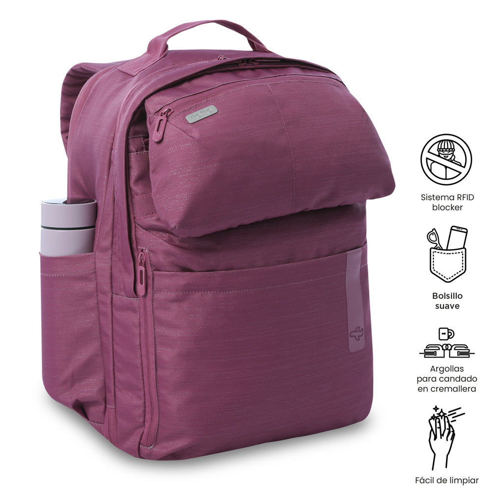 Always take it with you! The Elan travel backpack is perfect as carry-on luggage. Its compact and functional design includes a dedicated compartment for your laptop up to 16 inches, internal compression straps that secure the contents, and a back strap to attach it to the telescopic handle of your luggage. Made of polyester, it is durable, lightweight, and practical for both urban trips and travel. Pack effortlessly!