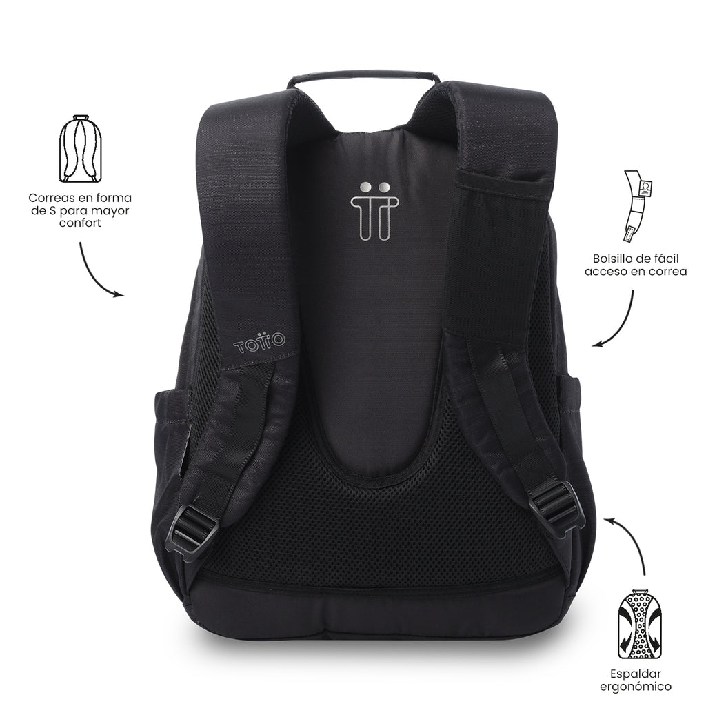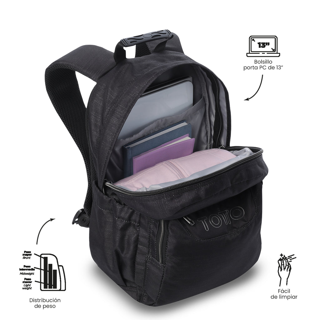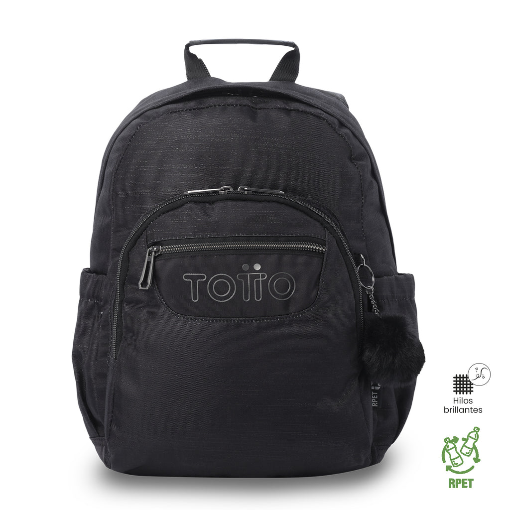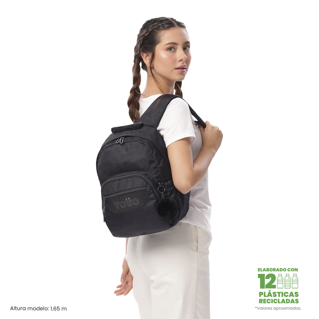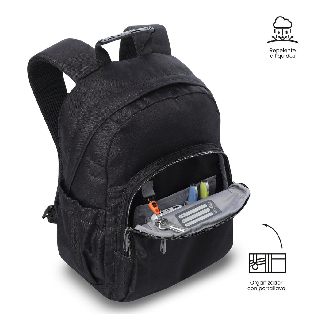 Carry everything with the Gommas Neo youth backpack! It features a dedicated pocket for your 13-inch laptop, an organizer with a key holder, side pockets for a bottle or umbrella, a mesh pocket for ID, two front zippered pockets, a rubber handle, ergonomic straps with air mesh, and a padded back that distributes weight. Made from recycled RPET canvas woven with shiny threads for a unique touch. Plus, it is liquid-repellent. Take it with you today!