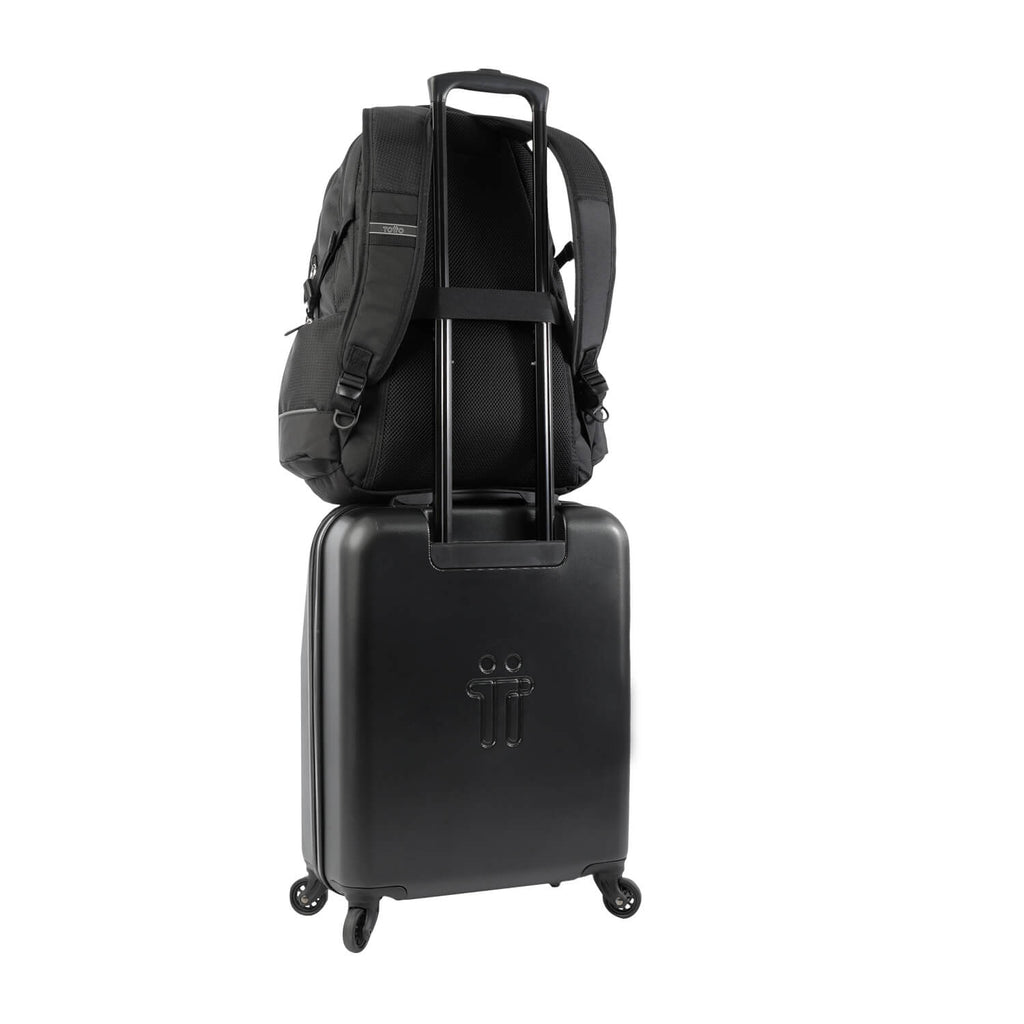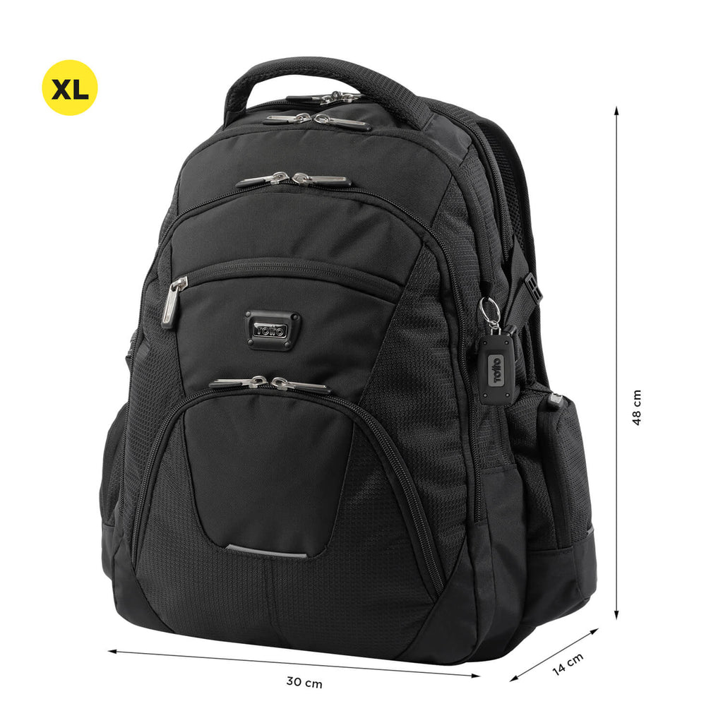 This large backpack features a 15.4" laptop pocket and multiple compartments for flawless organization. Made of durable canvas, it includes a soft pocket for delicate items, an organizer with a key holder, loops for a padlock, reflective piping, external compression straps, and a slot for a wheeled system. Its ergonomic design and padded back panel ensure all-day comfort at the office.
