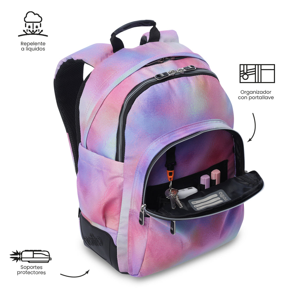 Discover the Rayol Glitter youth backpack that combines functionality and sparkle! It includes a pocket for your 14-inch laptop, side pockets for a bottle or umbrella, and front pockets for easy access. Its S-shaped straps and ergonomic back with Air Mesh distribute weight for maximum comfort. Made of RPET canvas with a glitter finish, it’s easy to clean. Carry it and make your school style stand out with practicality!
