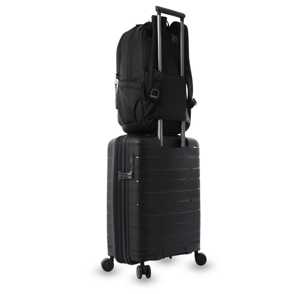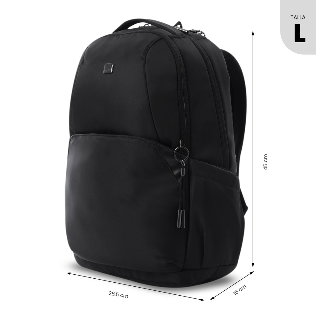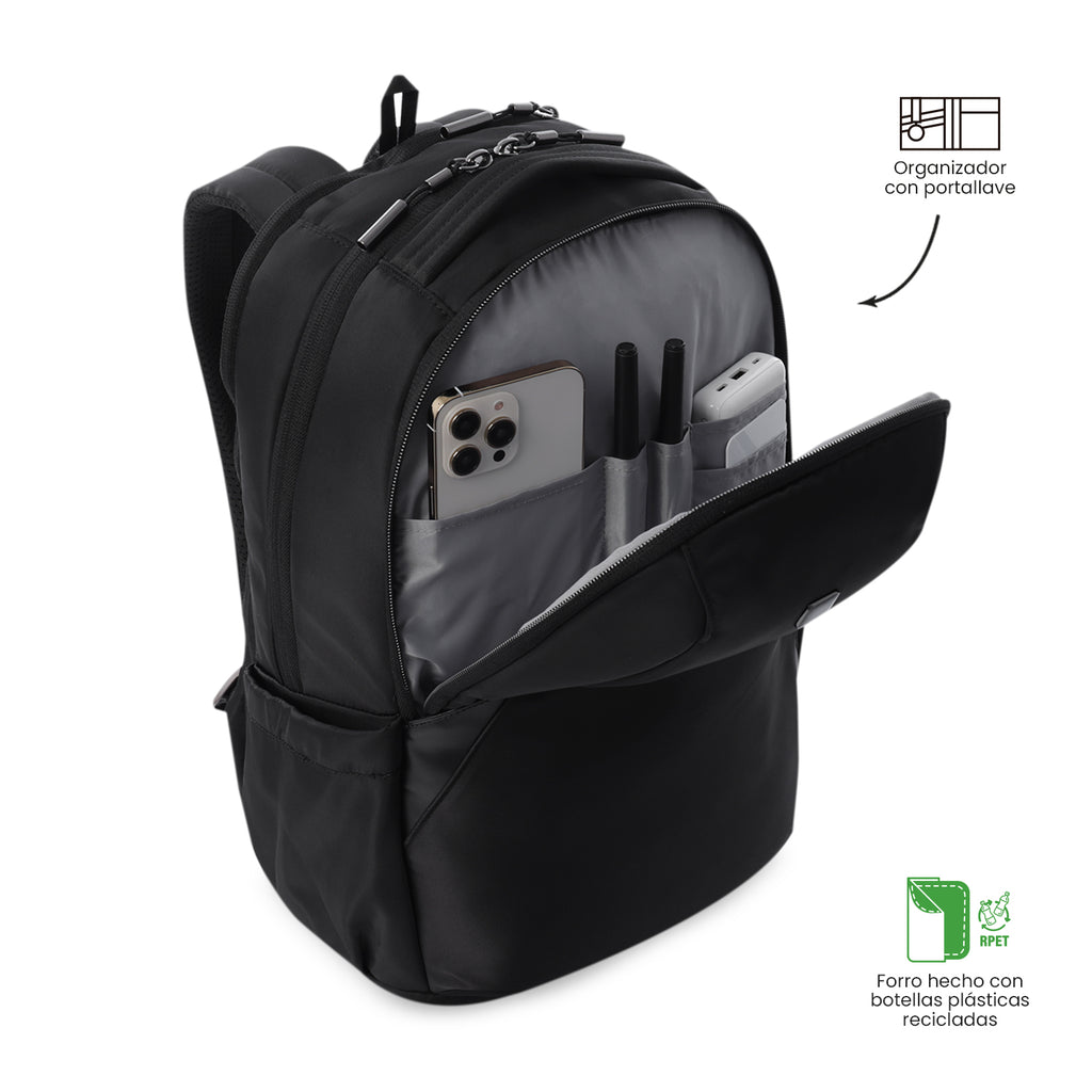 The Roxanne backpack is made of twill polyester with an RPET lining made from 8 recycled bottles and metal details. Its spacious interior includes a compartment for a 16" laptop, a secret pocket, a key holder, an internal zippered pocket, multiple organizational spaces, a bottle pocket, and an additional pocket on the top of the back panel. Features a wheel pass-through, metal bottom supports, and padded straps. Get it now!