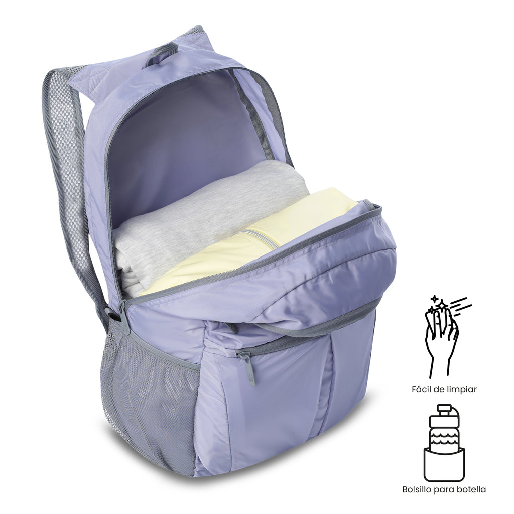 Pack smart! This Noka 20 foldable travel backpack offers ample space with a main zippered compartment and external pockets perfect for carrying documents or personal items. Its practical design allows it to be folded and stored easily. Lightweight, durable, and made of 100% polyester, it is ideal for short trips. Remember to check its dimensions with your airline before flying. Take it everywhere!