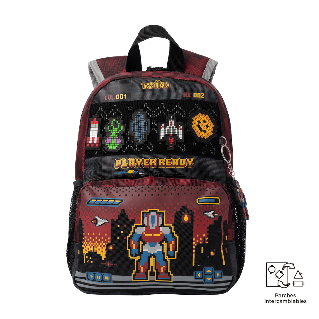 Bring functionality and fun to school with the Digibot backpack! The children's design, made of polyester, includes decorative patches that can be removed and relocated to customize it to their liking. It has a main compartment with double zipper closure, side bottle holder pockets and a front pocket with organizer. Its padded straps and top handle provide comfort. Includes an eye-catching robot keychain!
