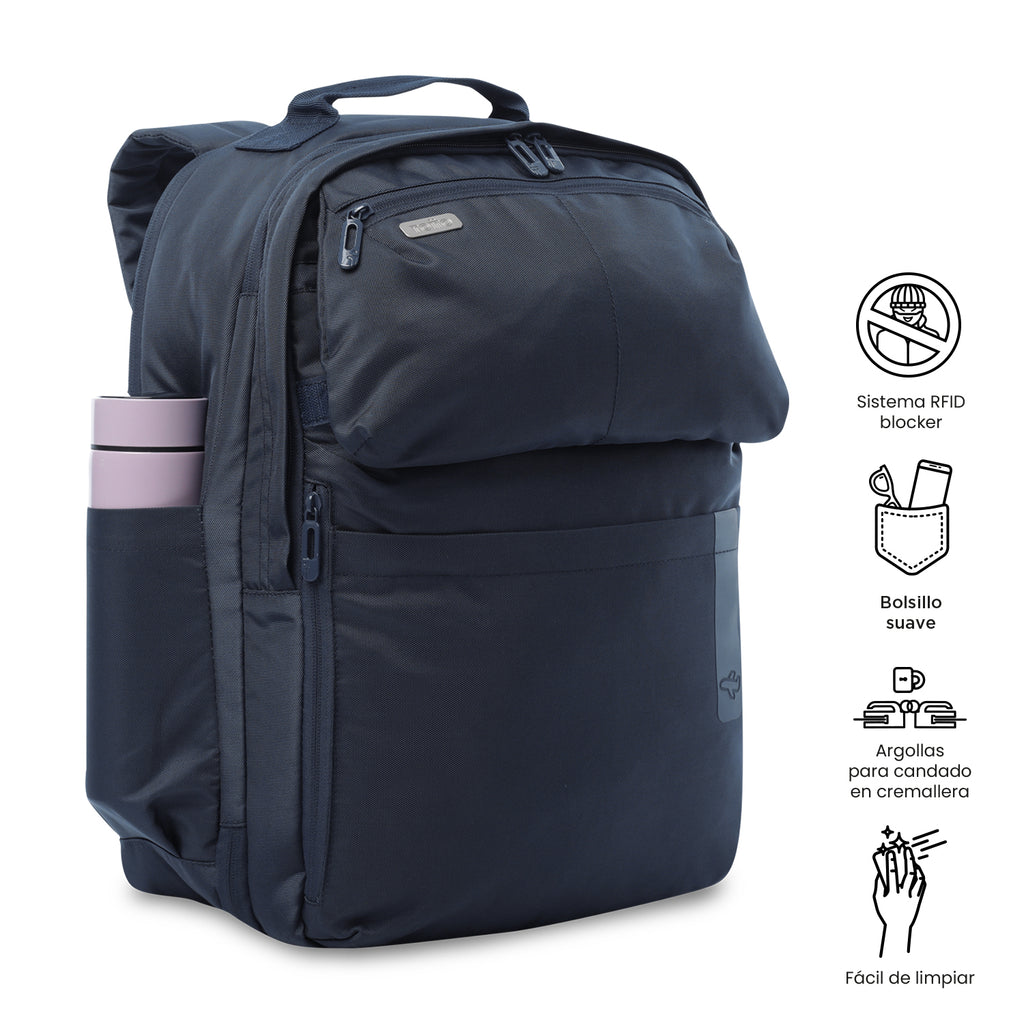 The Elan Travel backpack is ideal as a personal item thanks to its practical and functional design. It includes a 16-inch laptop sleeve for added security, internal compression straps that keep your belongings organized, and a strap to attach it to telescopic handles. Made from quality materials, it combines durability and lightness for your travels. Make it yours and carry everything you need with ease!