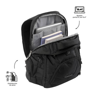 This large backpack features a 15.4" laptop pocket and multiple compartments for flawless organization. Made of durable canvas, it includes a soft pocket for delicate items, an organizer with a key holder, loops for a padlock, reflective piping, external compression straps, and a slot for a wheeled system. Its ergonomic design and padded back panel ensure all-day comfort at the office.