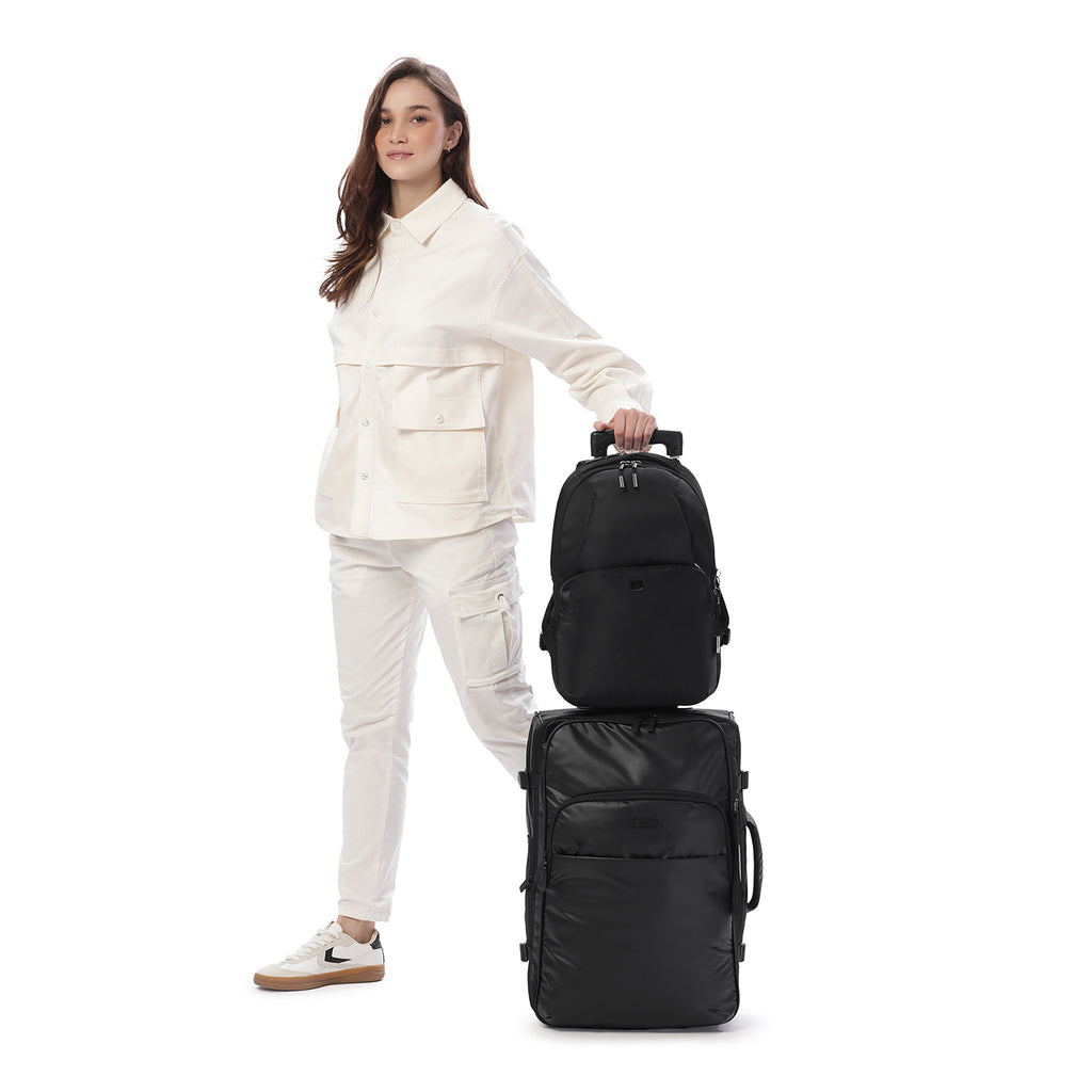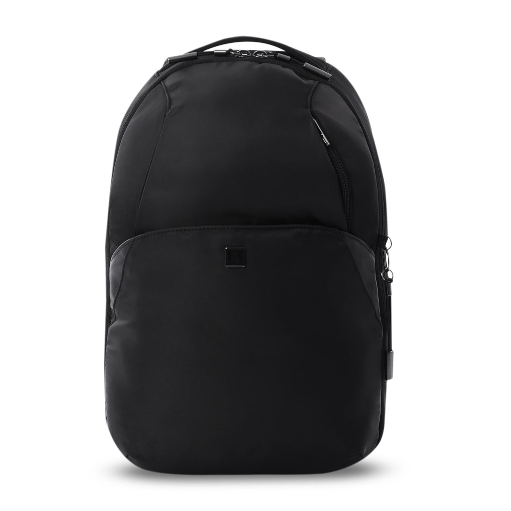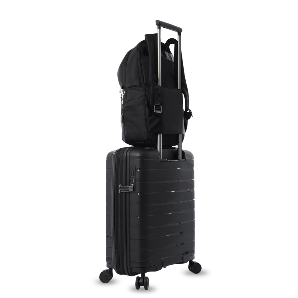 Optimize your workday with style and functionality! The Roxanne backpack is made of twill polyester with a PU coating and RPET lining made from recycled bottles. It features a 15-inch laptop compartment, a simple organizer, a secret pocket, an internal zippered pocket, an internal bottle pocket, a luggage strap, and metal protective feet. It includes a keychain on a cord with metal stoppers. Just for you!